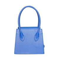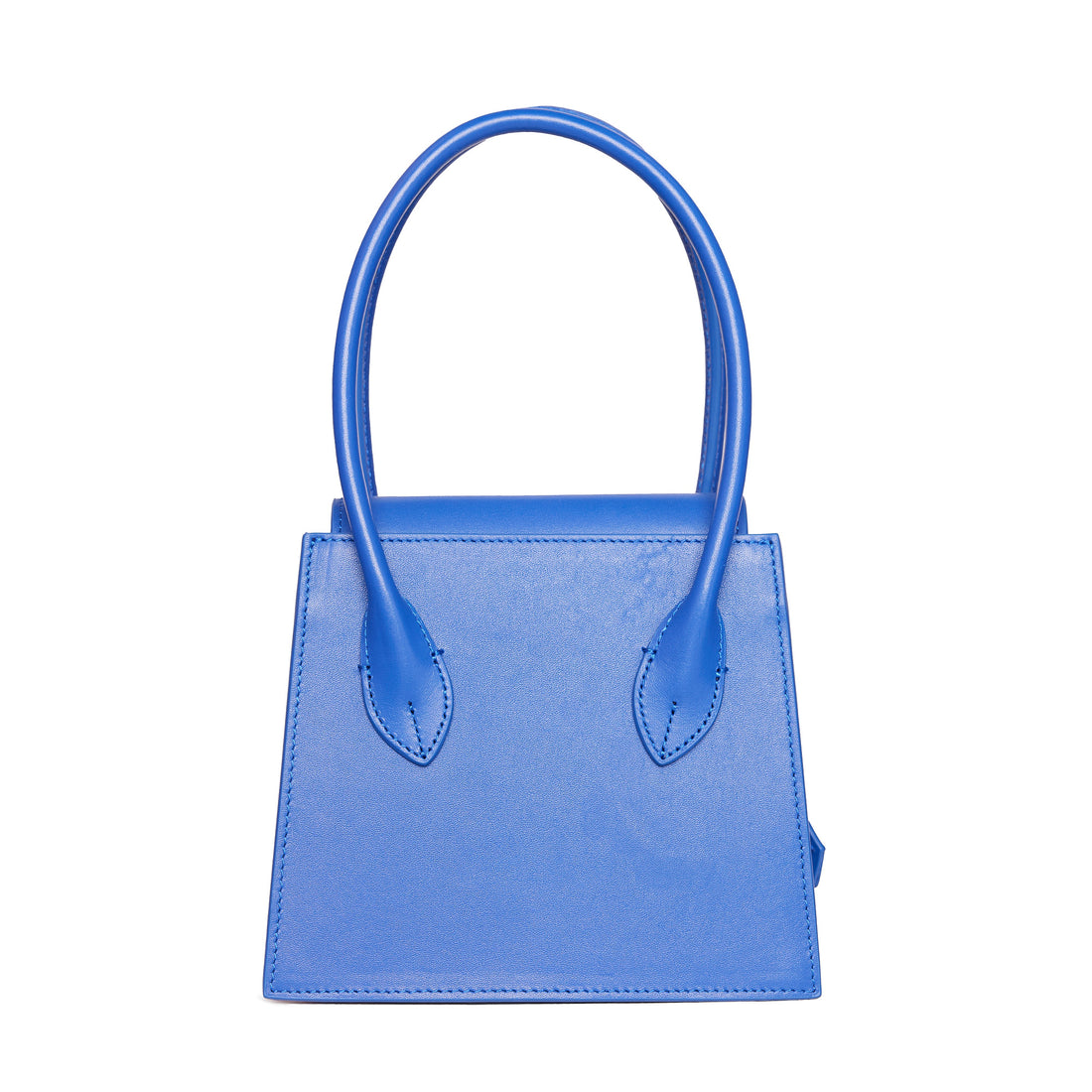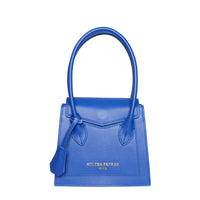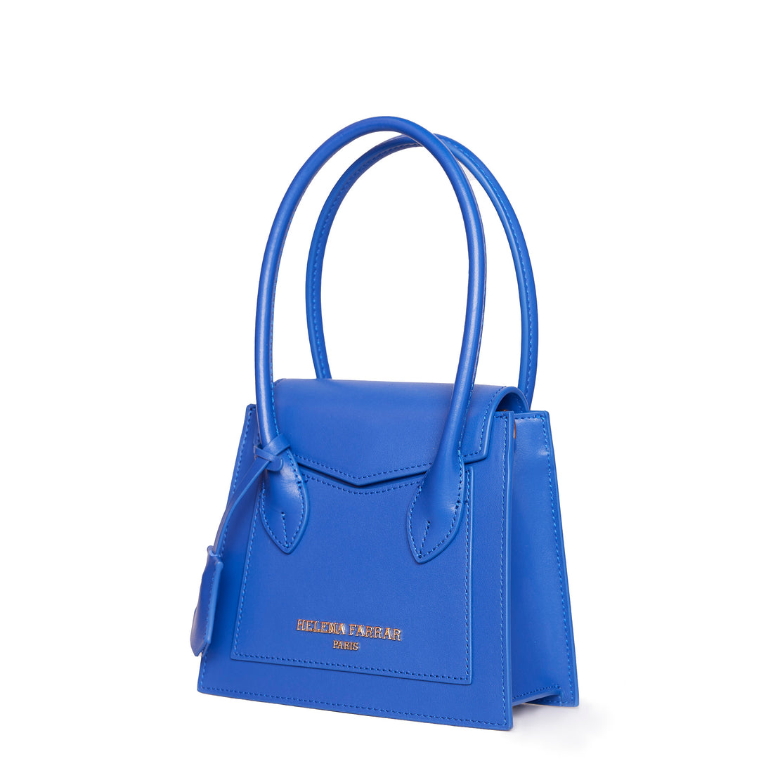 The Merci Mini Handbag in Royal Blue Leather with Gold Hardware Featuring an Envelope Magnetic Closure Detail.