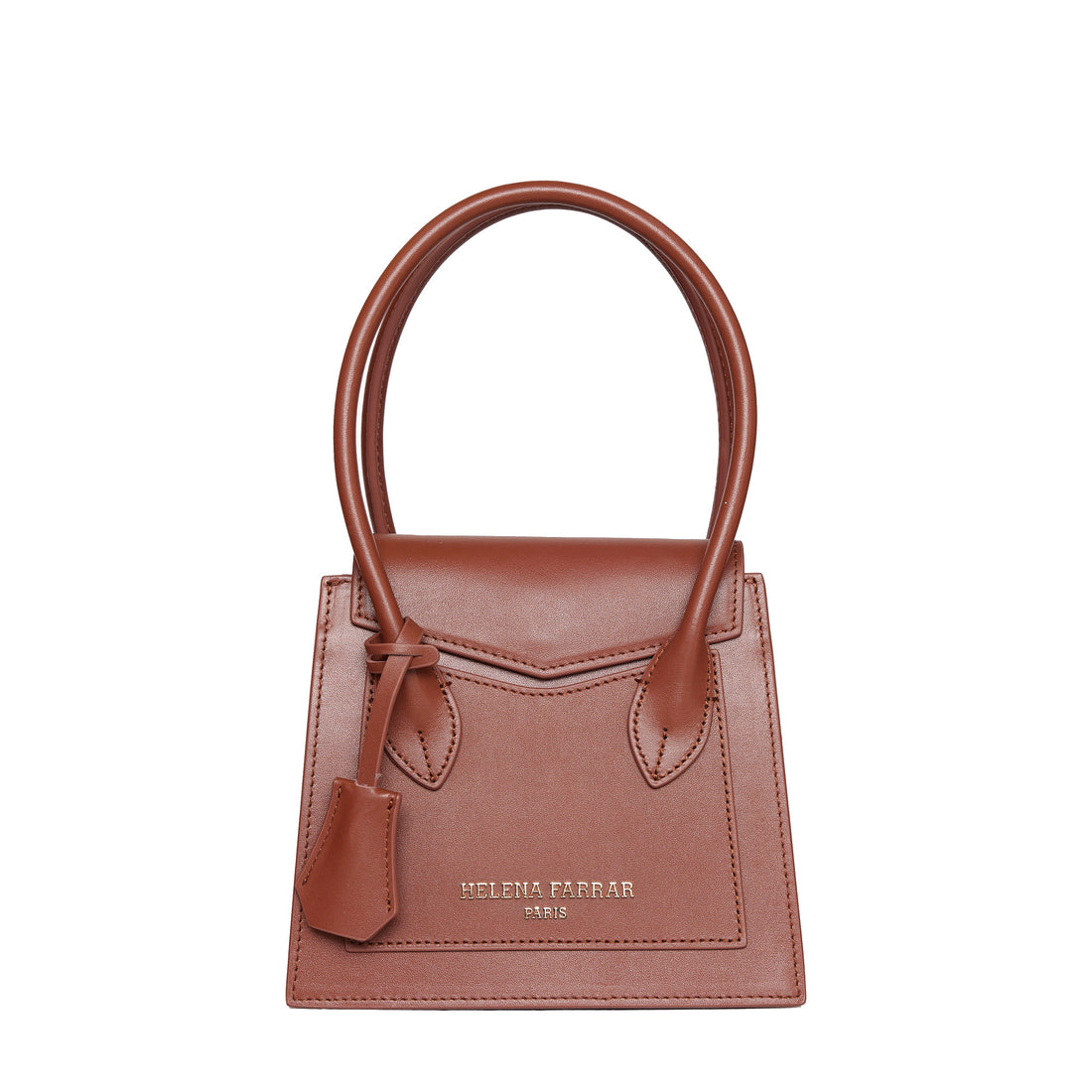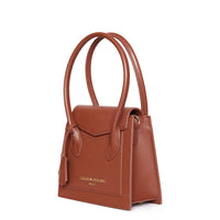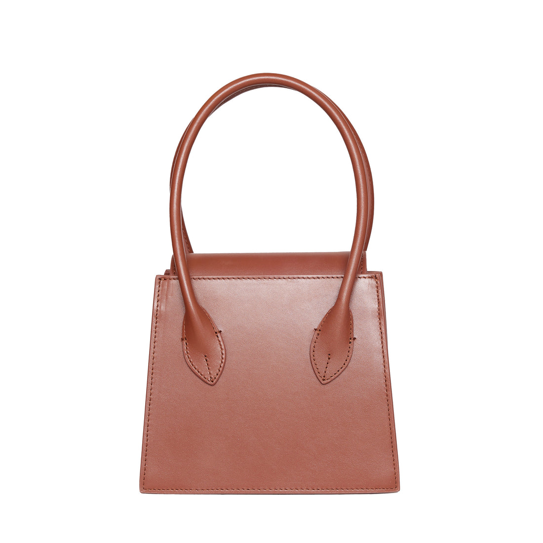 The Merci Mini Handbag in Chocolate Brown Leather with Gold Hardware Featuring an Envelope Magnetic Closure Detail.